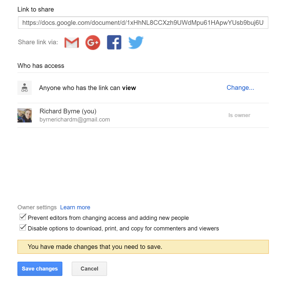 One the original selling points of Google Docs was document sharing and collaboration. That feature is still the thing that makes Google Docs special. In fact, just yesterday at the BETT Show I saw someone presenting just that feature. But sometimes you want to share your documents without letting other people make copies of them or print them. So when you open your sharing settings select “advanced” and you can prevent people from copying, downloading, or printing your documents.