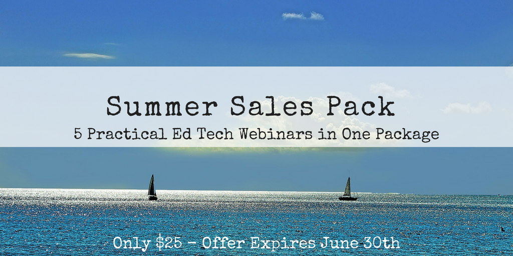 Throughout the year I offer many professional development webinars on PracticalEdTech.com. The sales of those webinars help to keep this blog running. This week I’ve been running a sale on PracticalEdTech.com webinars and many people have taken advantage of it. The sale runs for two more days. In this summer sales pack of webinars I have included my most popular webinars of the last six months. You can watch these webinars whenever you like and as often as you like. Purchased individually these five webinars would cost $100. But during this sale you’ll get them all for just $25!