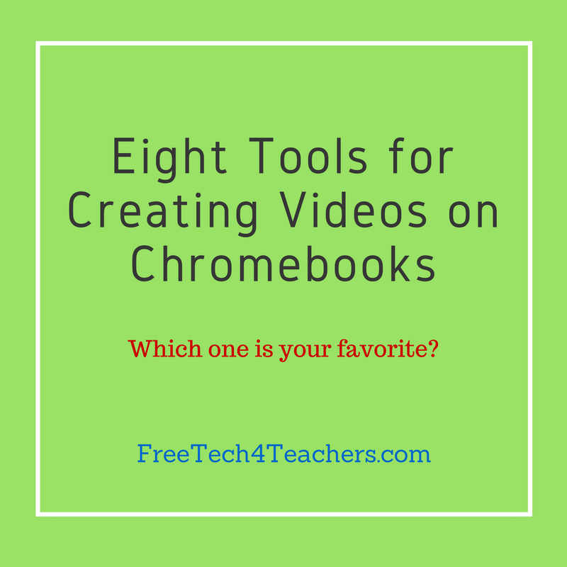 A couple of days ago Tony Vincent Tweeted my list of tools for creating videos on Chromebooks. That list was last updated in November. Tony’s Tweet prompted me to update the list again. The notable differences between this list and the last one is that I’ve removed Wideo because that service no longer offers any free options for teachers or students. I’ve also added three new tools in Sharalike, CaptureCast, and Magisto.