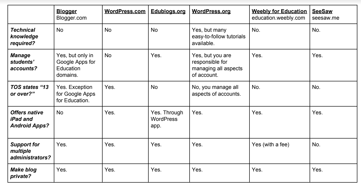 Comparison of Six Blogging Services for Teachers outlines the administration options, design options, domain mapping options, and TOS conditions amongst other key features to look for when picking a blogging service to use in your classroom. You can get a Google Docs copy of the chart here and a PDF version here.