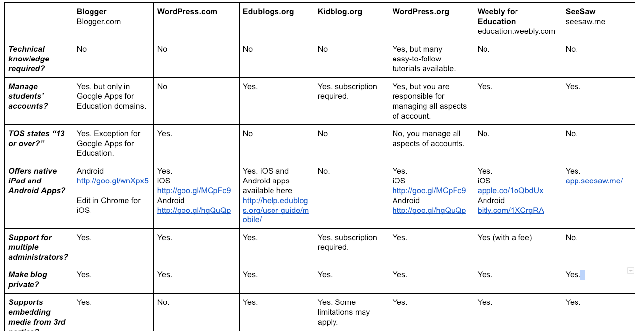 The Edublogs Student Blogging Challenge kicks-off two weeks from now. You don’t need to be an Edublogs user in order for your students to participate in the challenge. If you’re new to blogging or new to having students blog, Edublogs is a solid choice for a blogging platform. Edublogs isn’t the only option for student bloggers. In this updated chart I compare seven options for creating student blogs.