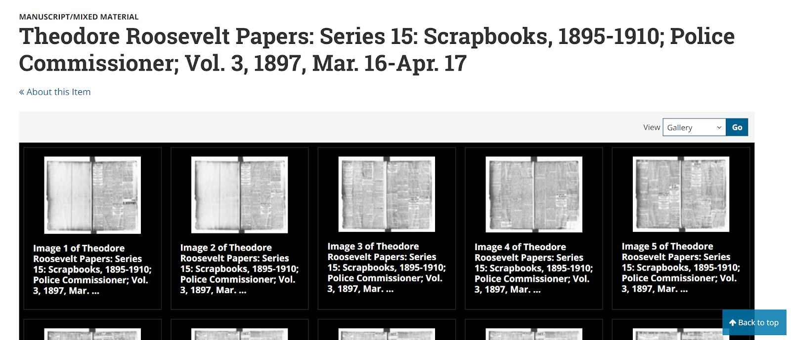 The LOC’s collection of Theodore Roosevelt’s papers is divided into sixteen sections. Included in those sections are his personal diaries, executive orders, speeches, and business papers. One section that I find particularly interesting is the collection of the scrapbooks that he kept. Like most online Library of Congress artifacts, you can download copies of Roosevelt’s papers.