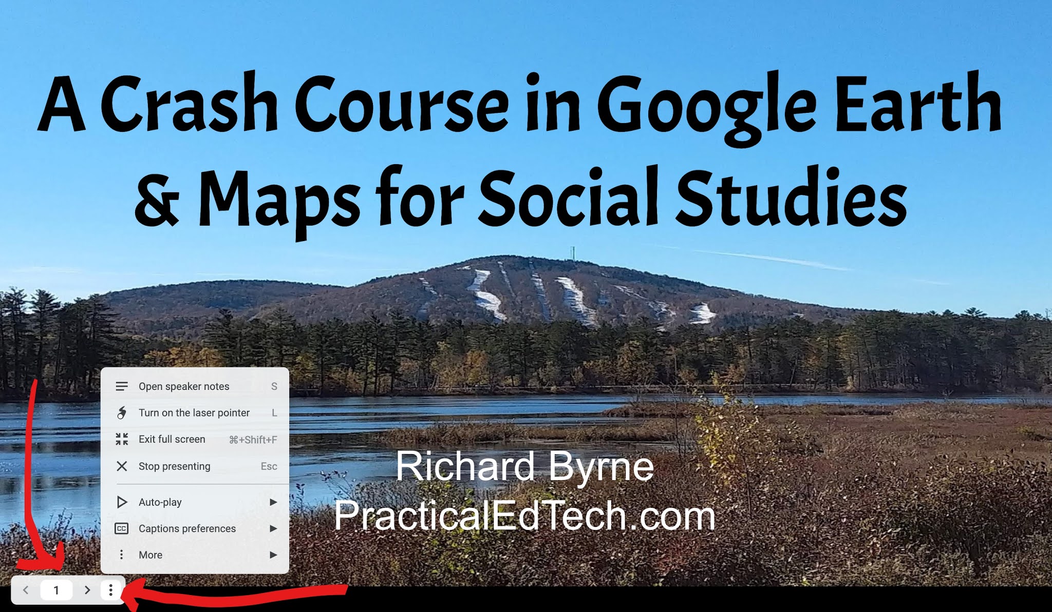 Just like before you still need to click the “present” button in the Slides editor. You’ll notice the changes after doing that. When you enter the full presentation mode you’ll notice that the large menu of presentation tools that used to be in the bottom, left corner of your slides is now gone! That large menu has been replaced by a tiny, easy-to-miss, menu that only appears when you hover your cursor over the bottom, left corner of your slides. When the menu does appear it will only show the number of the slide that you’re on an arrow to advance your slides. To get the full list of presentation options you’ll have to open the little “three dot” menu that appears next to the slide advancement arrow. See my screenshot below for picture of the new menu when opened.