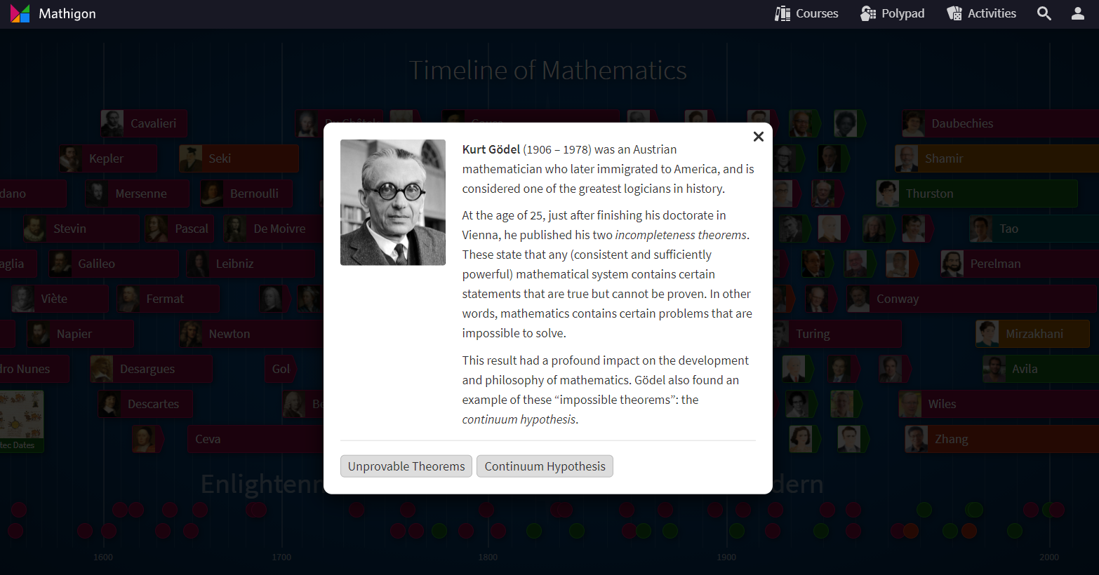 Mathigon’s Timeline of Mathematics is an interactive timeline of developments in mathematics throughout history. The timeline begins with the development of the first counting systems and progresses through today. Throughout the timeline there are images and names to click on to learn more about each development. For example, at the beginning of the timeline you can click on an image of the Ishango Bone to learn that this artifact is the oldest representation of early counting systems. Much later in the timeline you can click on the image of Kurt Gödel to learn about his contributions to mathematics and click on examples of his theorems in practice.