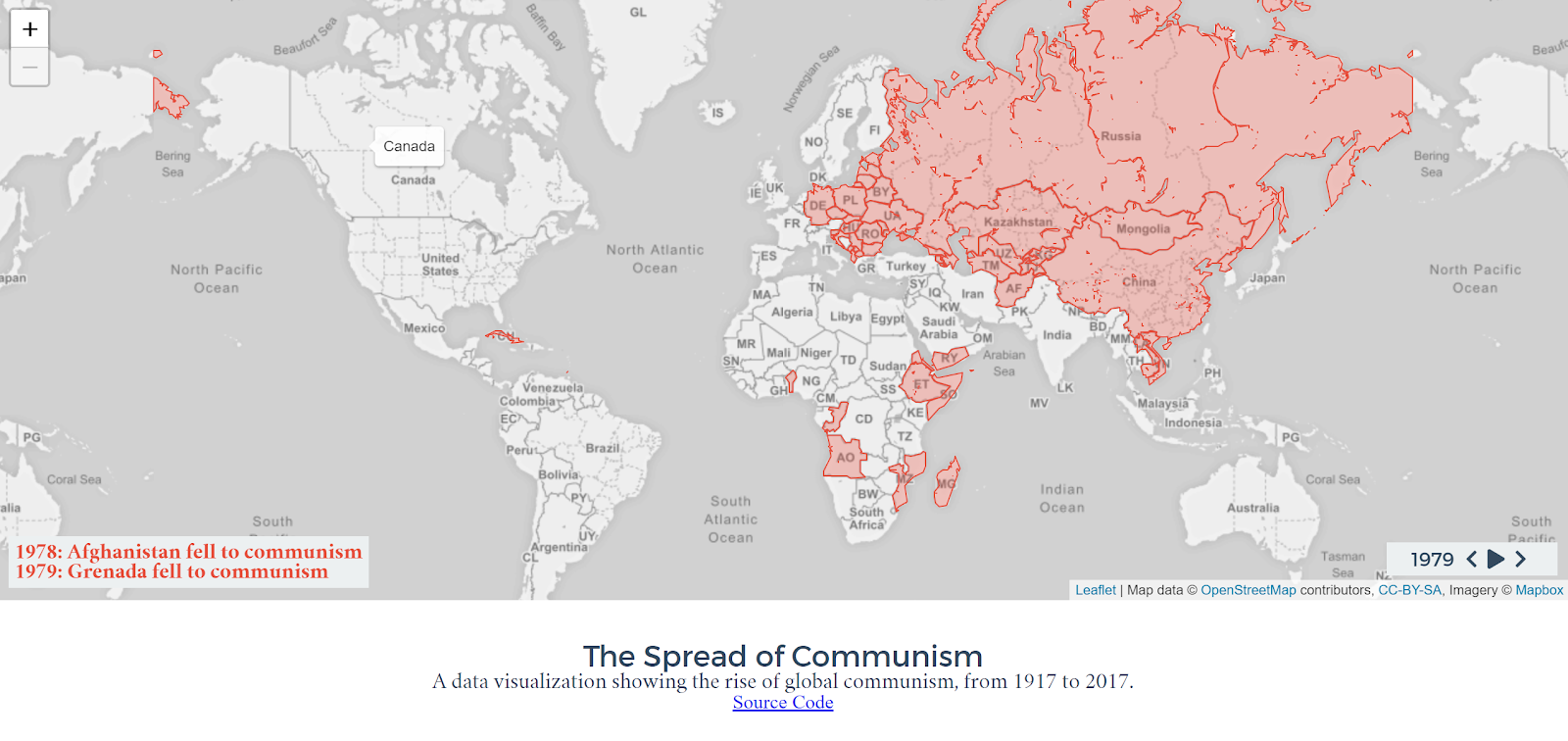 The Spread of Communism is an animated map that shows the rise and fall of communism from 1917 through 2017. When you visit the map you can press the play button in the lower, right corner to play the animation. When it plays the animation highlights each country according to the year in which a communist government came to power. Play the animation long enough and you will start to see the highlights disappear as the communist governments fail.