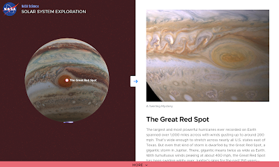NASA’s Solar System Exploration website contains interactive displays of the planets, dwarf planets, and moons of our solar system. To launch an interactive display just choose one of the planets, dwarf planets, or moons from the menu in the site’s header. Each display includes little markers in it. Click one of the markers to open a side panel that contains information about that particular feature of the planet, dwarf planet, or moon. Below each interactive display you’ll find additional facts and figures.