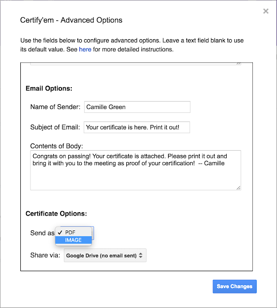 This week the developer of Certify’em, Dave Abouav, added some advanced options to the Add-on. The Add-on now lets you issue certificates as PDFs or as images. More significantly, you can now automatically issue certificates to students even if they don’t have email addresses. In the advanced settings in Certify’em you will now see an option to issue certificates via Google Drive instead of via email. This is perfect for students who don’t have email addresses but do have Google Drive accounts through your school’s G Suite for Education account.