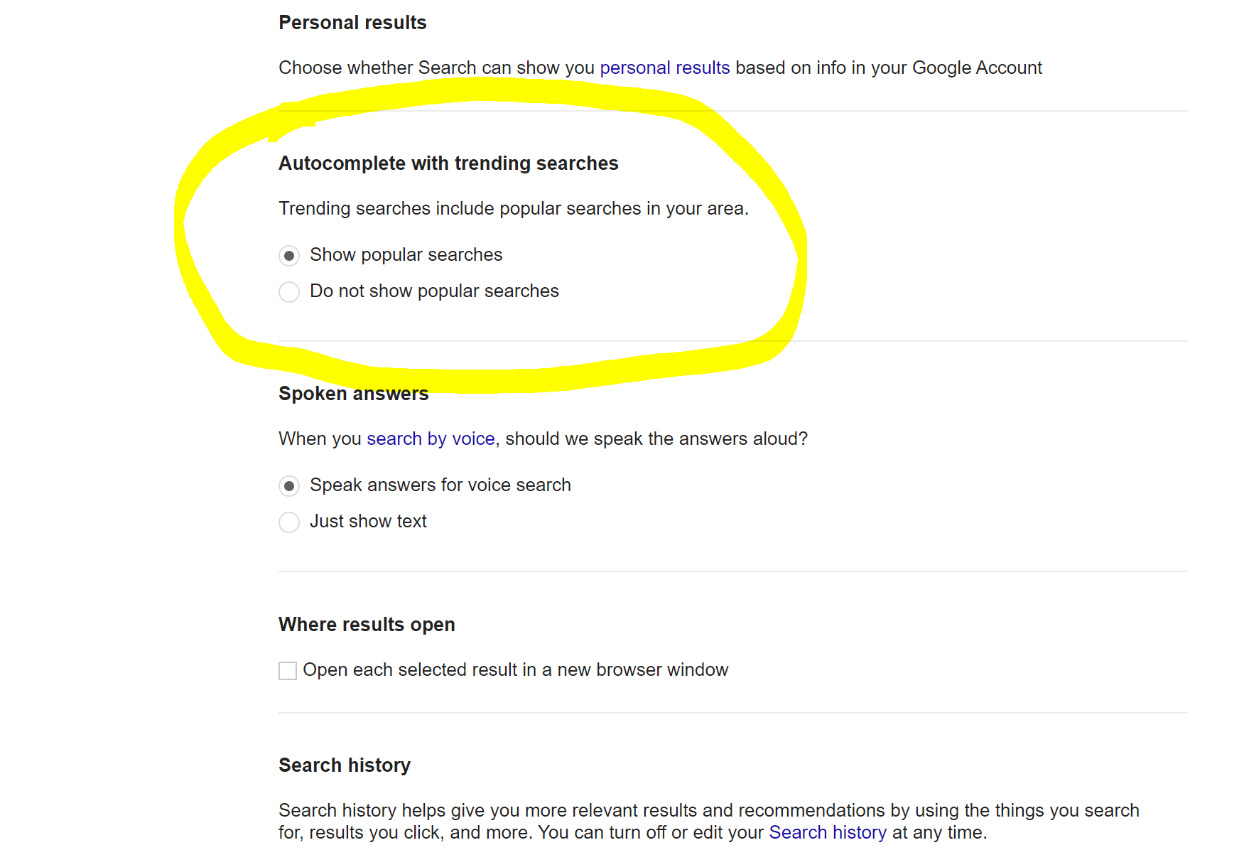 To turn off “autocomplete with trending searches” simply head to the Google search preferences page while you’re signed into your Google account. Then scroll down and select “Do not show popular searches.”