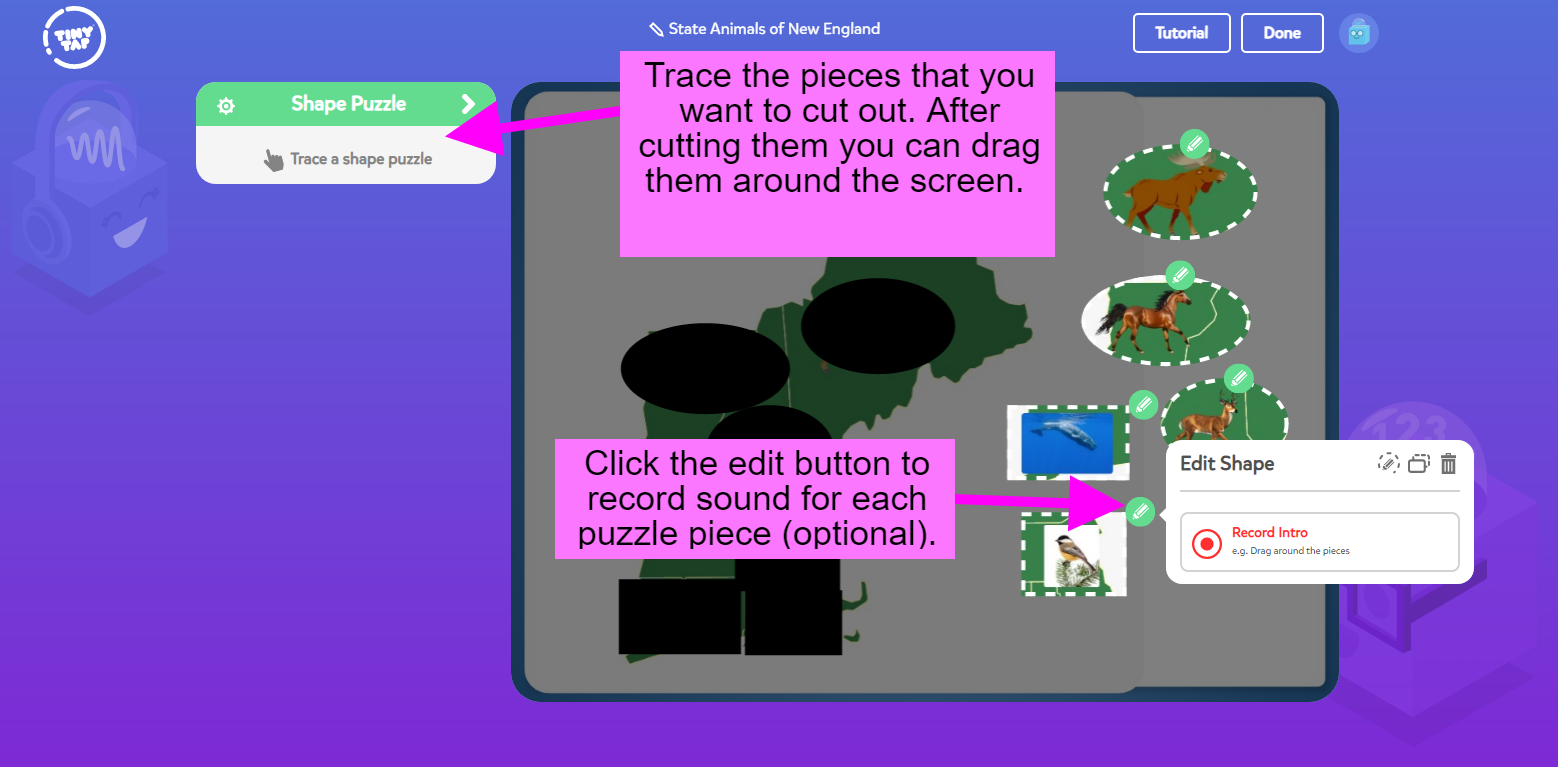 After arranging the elements of the game slide into the places where they represent the correct answers it’s time to choose an activity type. The activity type that I’m using for this game is “shape puzzle.” After selecting the shape puzzle option it is time to cut out the pieces that will be dragged into position when students play the game. Pieces are cut by using the tracing tools in TinyTap. As each piece is traced and cut it should be dragged over to the side or bottom of the slide to create a bank of pieces. It’s from that bank that students will select pieces to move during the game. It’s also important to note that you can record audio to accompany each puzzle piece that you create. In my game I simply read aloud the names of the animals in my puzzle pieces. Take a look at my screenshots below for more detail.