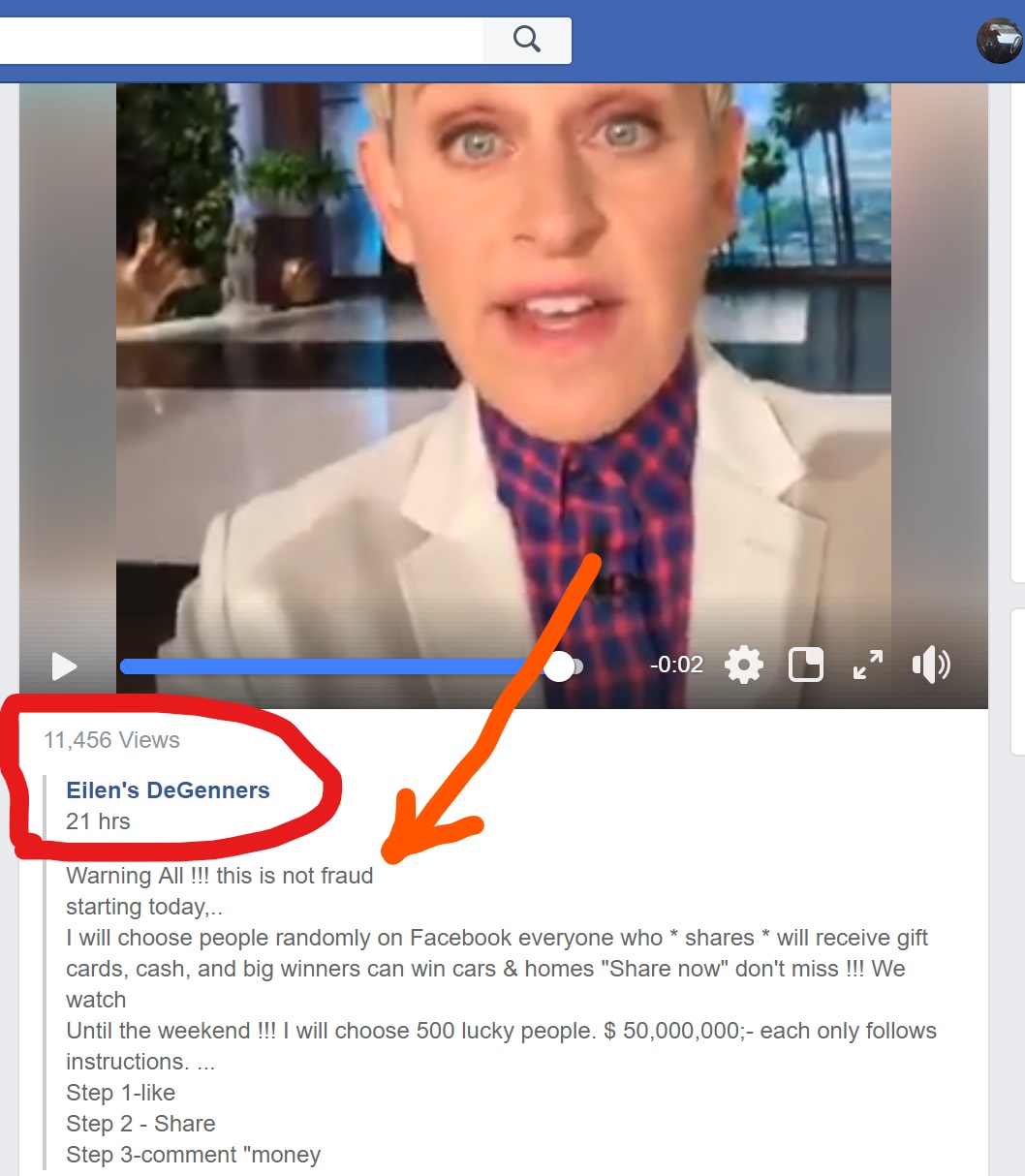 - A posting from a page that claimed to be Ellen Degeneres giving away money to people who shared the post and wrote “money” in the comments. This scam is particular laughable because the person who created the page didn’t even spell Ellen’s name correctly. If that wasn’t enough to make you suspicious, the first line of the posting is “Warning All!!! this is not fraud.” That has the sound of a used car salesman saying, “this is a great car only driven by an old lady to church on Sunday!”
