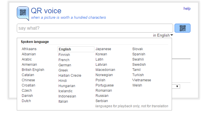 QR Voice is a free tool that allows you to create QR codes that when scanned will play a short audio message. To create your message and QR code you can record a voice message by clicking the microphone icon on QR Voice or you can type in your message. Either way you’re limited to 100 characters. QR Voice will play back in your choice of forty languages.