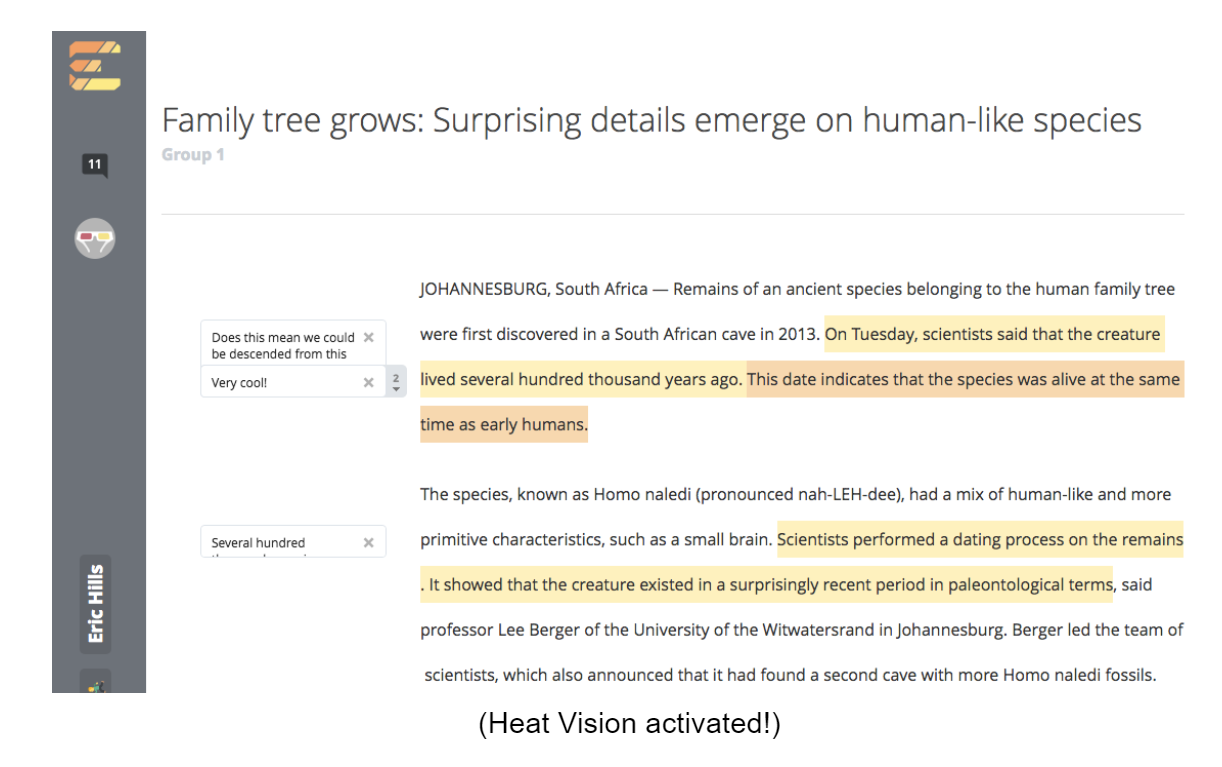 One key feature of Edji is called “Heat Vision.” Teachers can toggle Heat Vision on or off. When you turn Heat Vision on, all highlights and comments will appear for all students to see. Text that has been highlighted by students will appear in colors ranging from yellow to dark red depending on how many students highlighted that area. Most teachers will likely leave the Heat Vision feature off until students have had time to highlight and comment. Once they are done, you can turn on Heat Vision to show common highlights and comments.