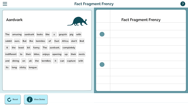 Fact Fragment Frenzy lets students practice identifying facts in a passage by having them drag words from a text into a digital notebook within the app. The app contains five practice passages.