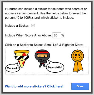 To include stickers in your Flubaroo grade distribution simply select the “advanced options” when you are sharing grades. Then select “sticker set-up”to choose the stickers that you want to use. You can choose a grade cut-off line for when a sticker is or isn’t distributed to students. See the complete process here.