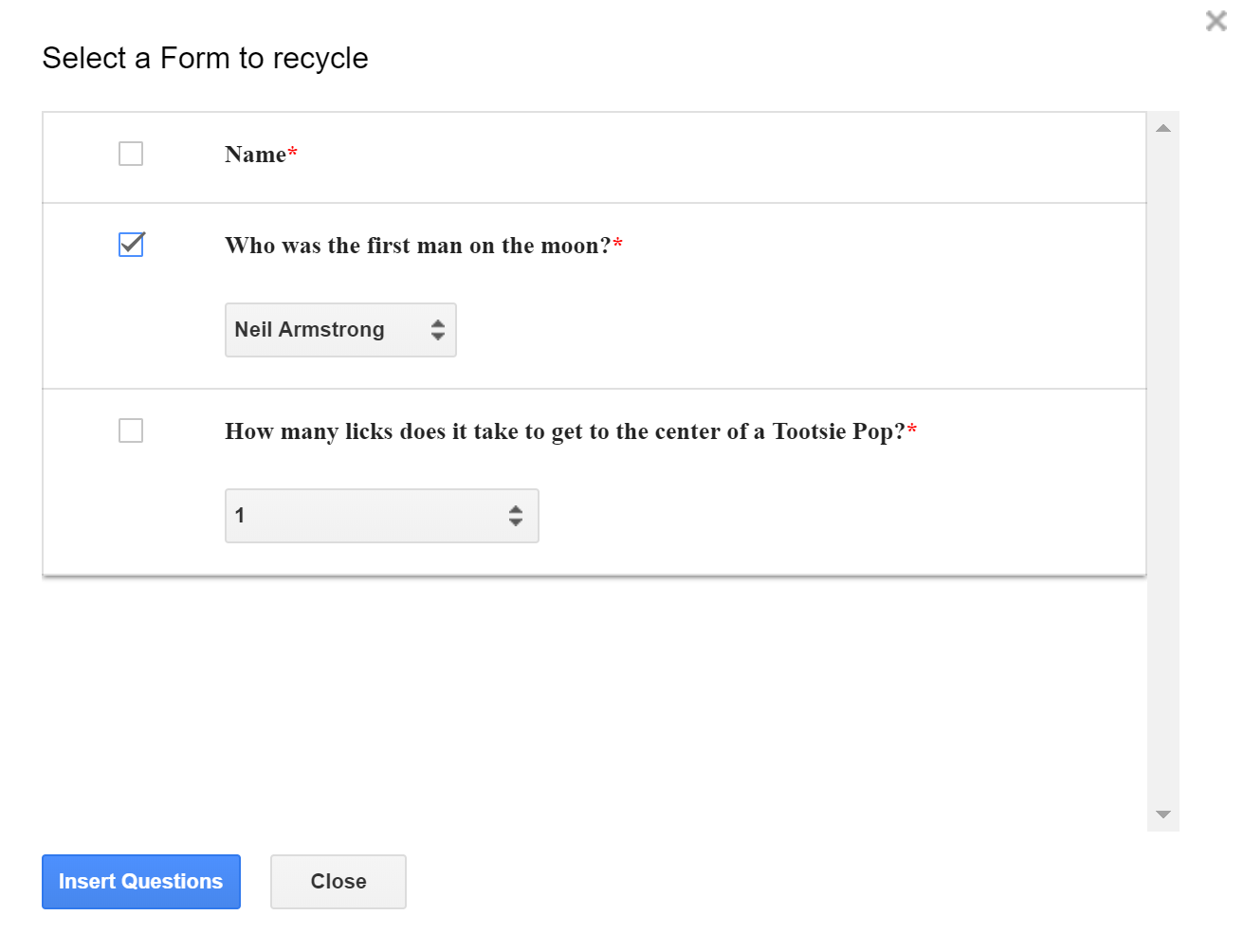 formRecycler is a free Google Forms Add-on that makes it easy to reuse questions from one Google Form into another form. When you have the formRecycler Add-on installed you can access all of your existing Google Forms and then pick questions from one of those existing Forms to use in a new form. You can use formRecycler multiple times on the same form and thereby include questions from multiple existing forms in your new form.