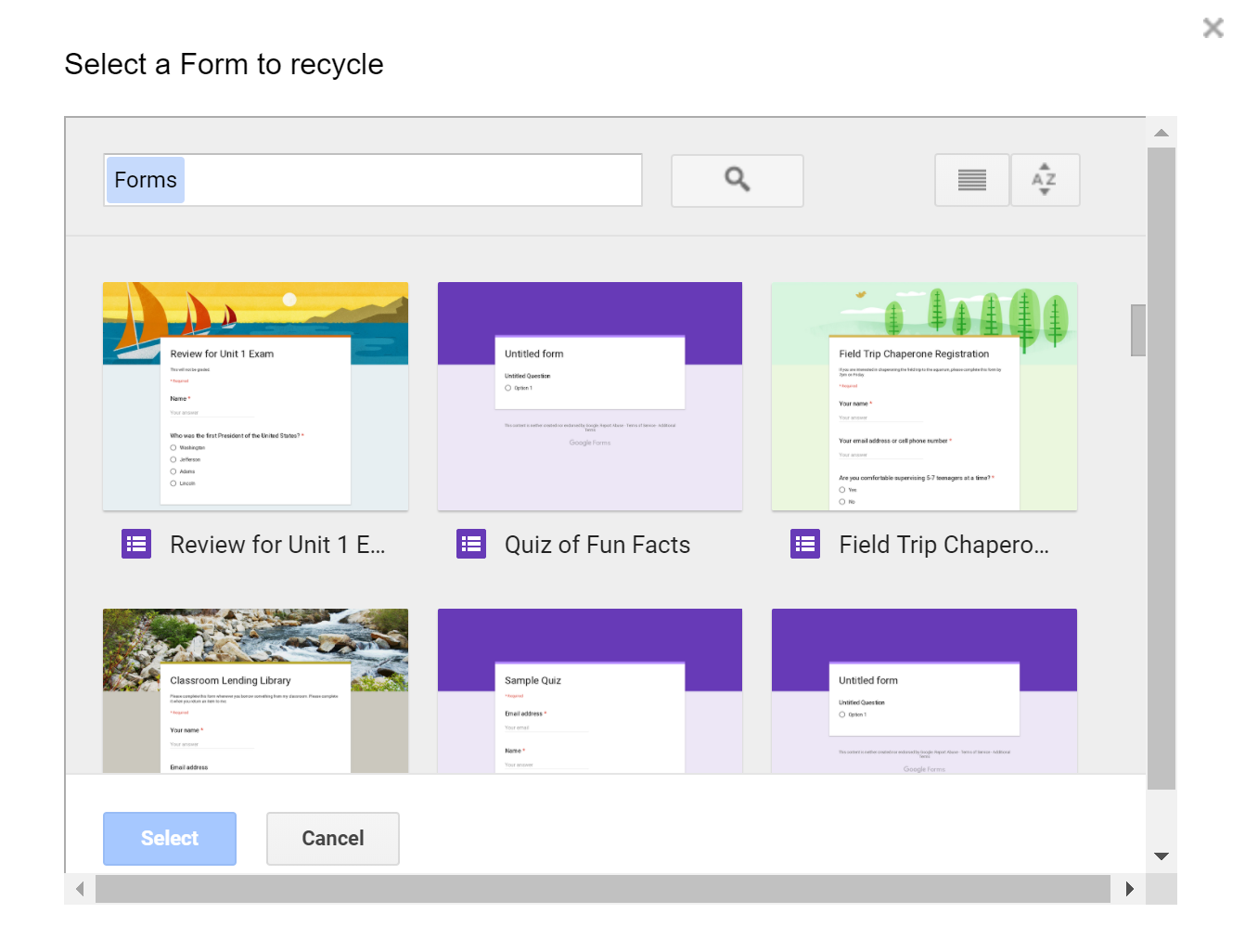 formRecycler provides a great way to quickly assemble a review quiz by selecting questions from prior quizzes given through Google Forms. For example, at the end of the semester I often would give students a practice quiz that featured the most difficult questions from quizzes given earlier in the semester. formRecyler makes that process much easier than rewriting each question.