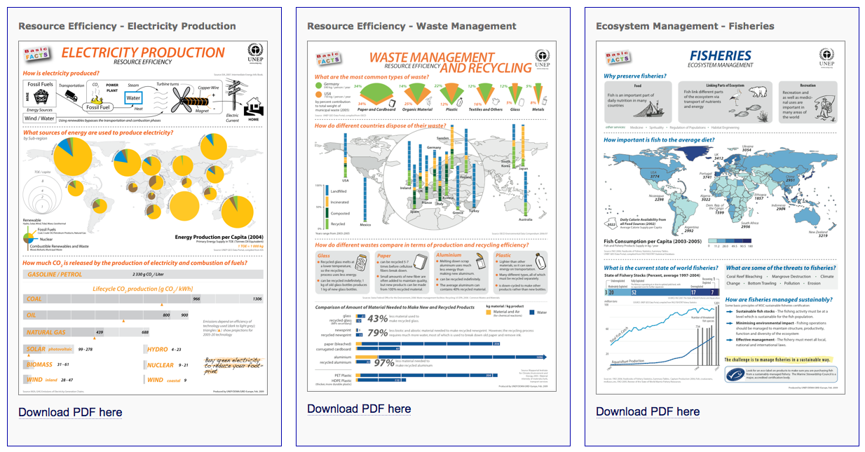 The United Nations Environment Program offers a series of free posters based on data from the UNEP’s Geo Data Portal. These posters use charts, graphs, and maps to display information about environmental data. Some of the topics covered in these posters include electricity production and consumption, CO2 emissions, ecosystems management, and hazardous materials. Each fact sheet, poster, and infographic is available as a PDF that you can download and print.
