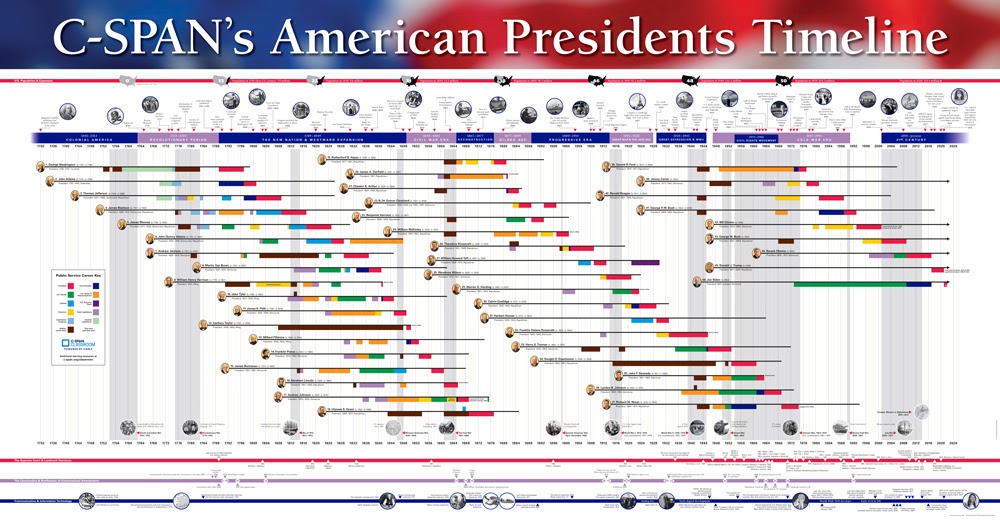 C-SPAN Classroom offers some fantastic resources for teachers of U.S. History, civics, and government. One of those resources that has been offered in the past and is available again this year is a free poster depicting a timeline of American presidents. The poster shows each President’s time in office, a short biography, the era of American history in which each President served, and a couple of major events that happened during each President’s time in office. The poster is free for anyone who has a free C-SPAN Classroom account.
