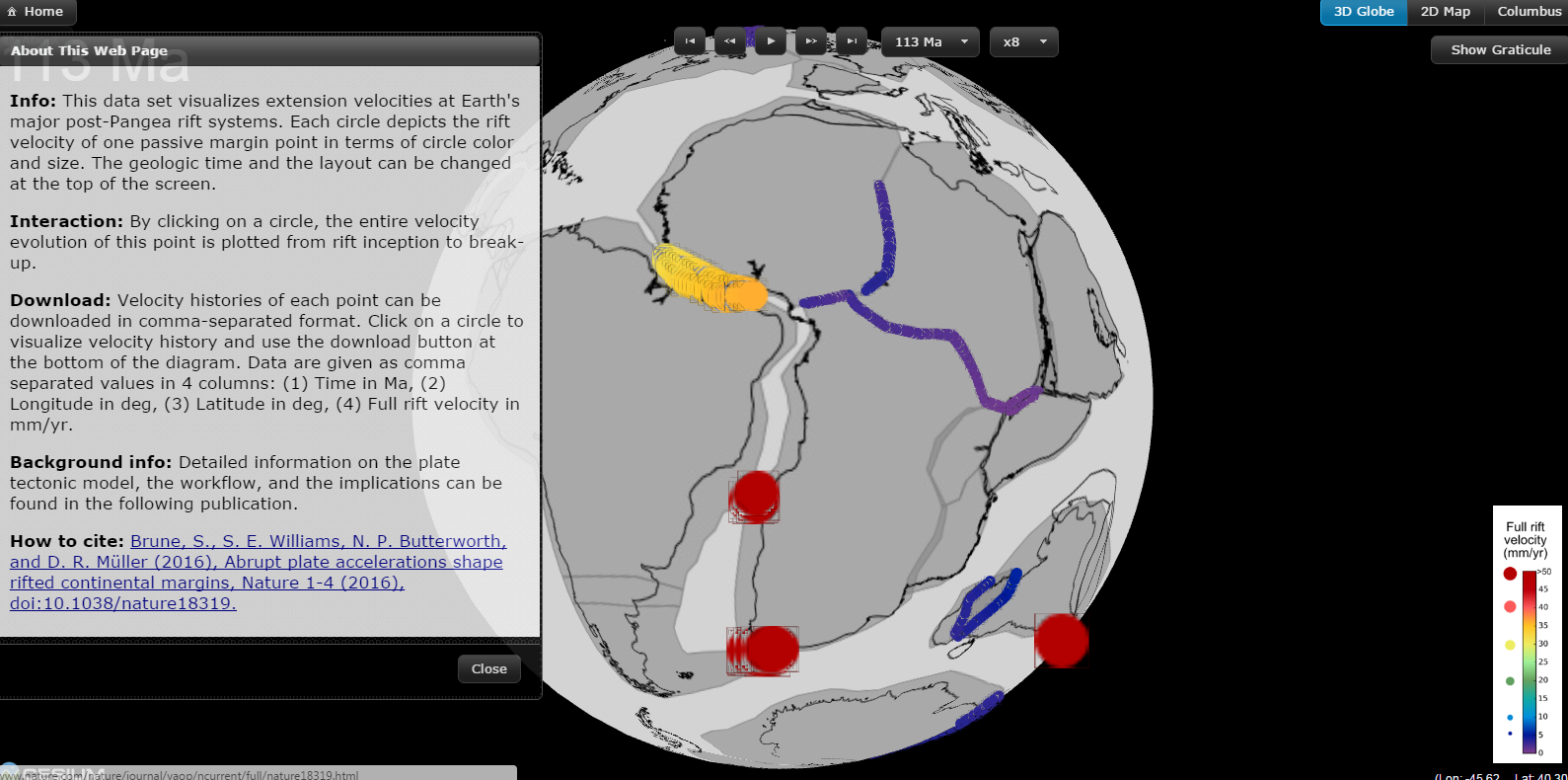The Rift Velocity map provides a visualization of continental drift over time. The map includes a timeline that you can play back to see a visualization of continental drift. The divisions between each continent are highlighted on the map. Click on the highlights to focus-in a specific drift rate.