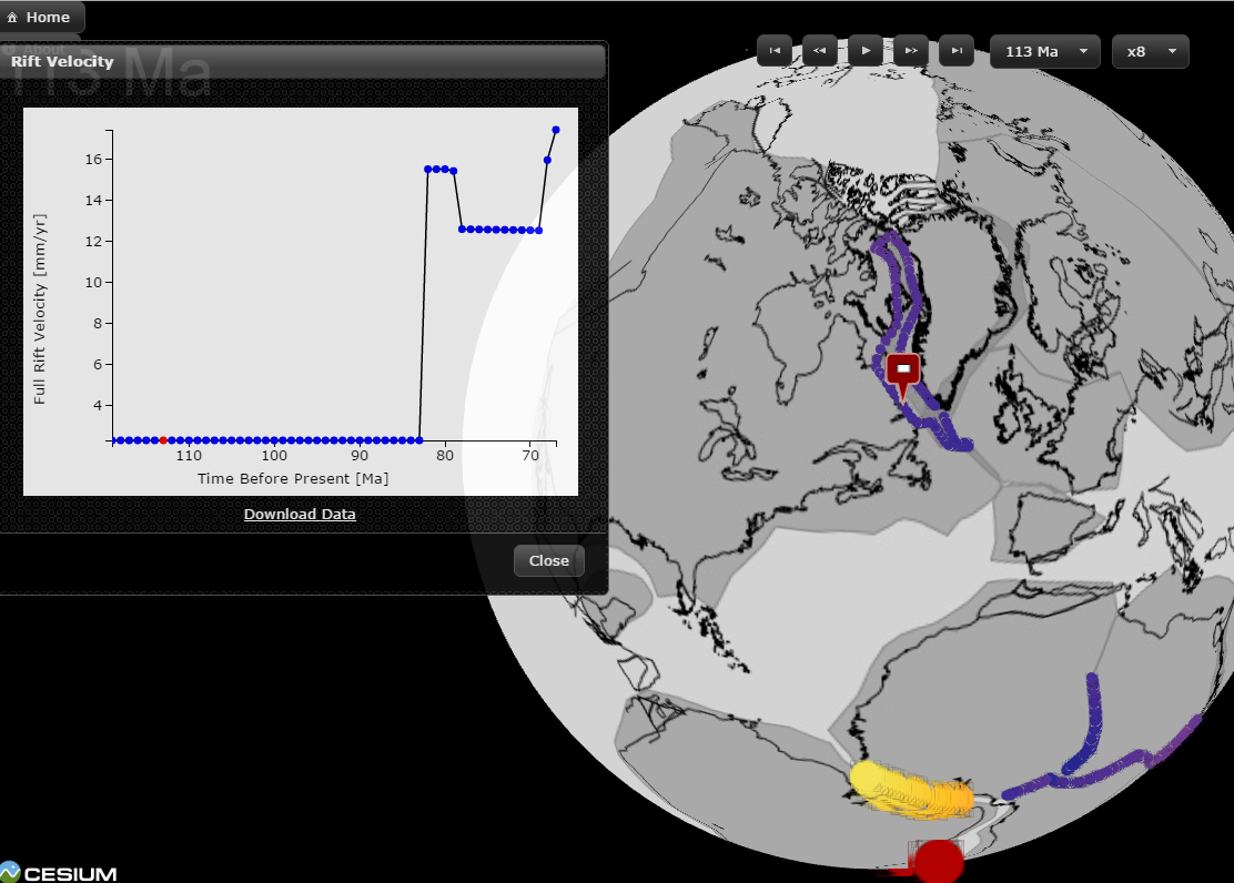 The Paleo Map Maker is similar to the Rift Velocity map in that you can see a visualization of continental separation. Rather than playing the visualization as an animation, the Paleo Map Maker lets you see static visualization of continental positions at specific times.