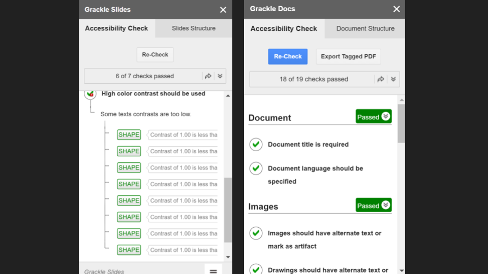 Grackle could make it quick and easy to ensure that your documents and slides meet your students’ accessibility needs. In addition to using it myself, I would consider having students use it on their Google Slides presentations just to help them evaluate their color and font choices.