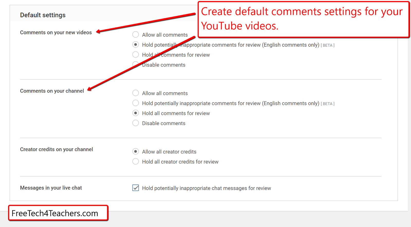 3. It is also in your community settings that you can specify the default for comment moderation on your channel. These settings will apply to all videos added to your channel. You can override these settings for an individual video.