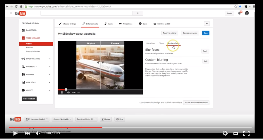 In the video embedded below I demonstrate how to blur faces and objects in your YouTube videos.