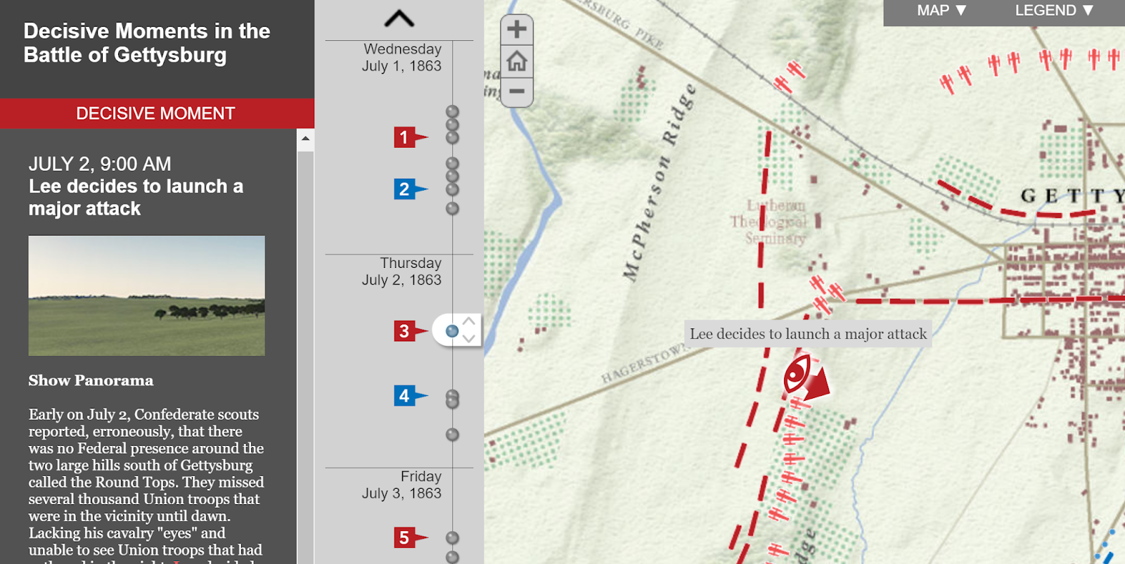 Decisive Moments at the Battle of Gettysburg is an interactive map hosted on Smithsonian.com. The map details events of the battle and the decisions made by commanding officers on both sides of the war. You can navigate the map by using the timeline on the left-hand side of the map or by clicking the placemarks on the map. While viewing the map you will see “eye” icons that you can click to view a panorama of that location. The panoramic view is of Gettysburg as it exists today.