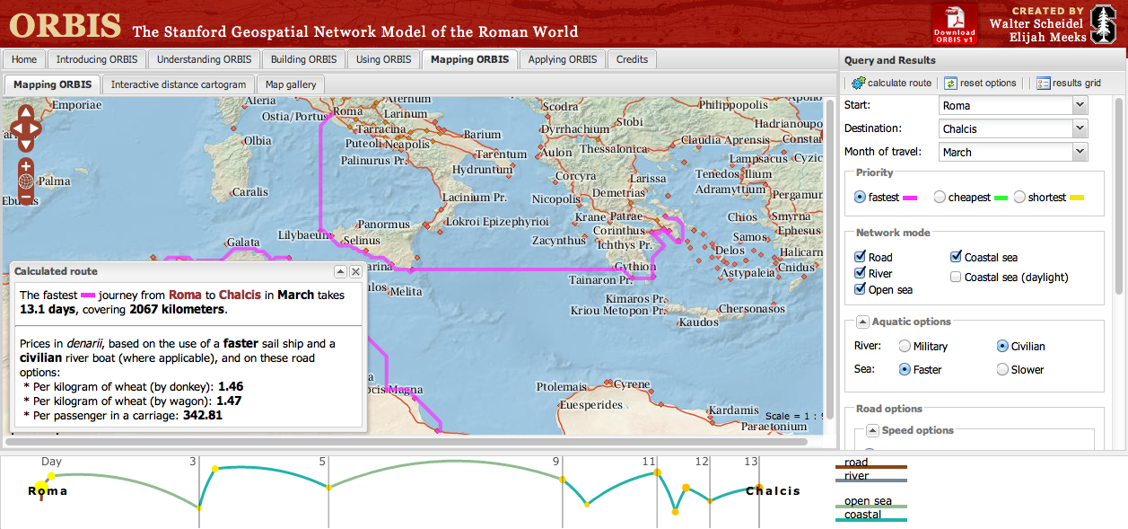 On ORBIS students can calculate the distance and travel times between 751 settlements in the Roman Empire. The calculations happen according to the modes of travel that would have been used during the time of the Roman Empire’s greatest height. For example, I calculated the time and cost to travel by foot, wagon, and boat between Roma and Chalcis in March. The calculations include the cost of feeding donkeys along the way.