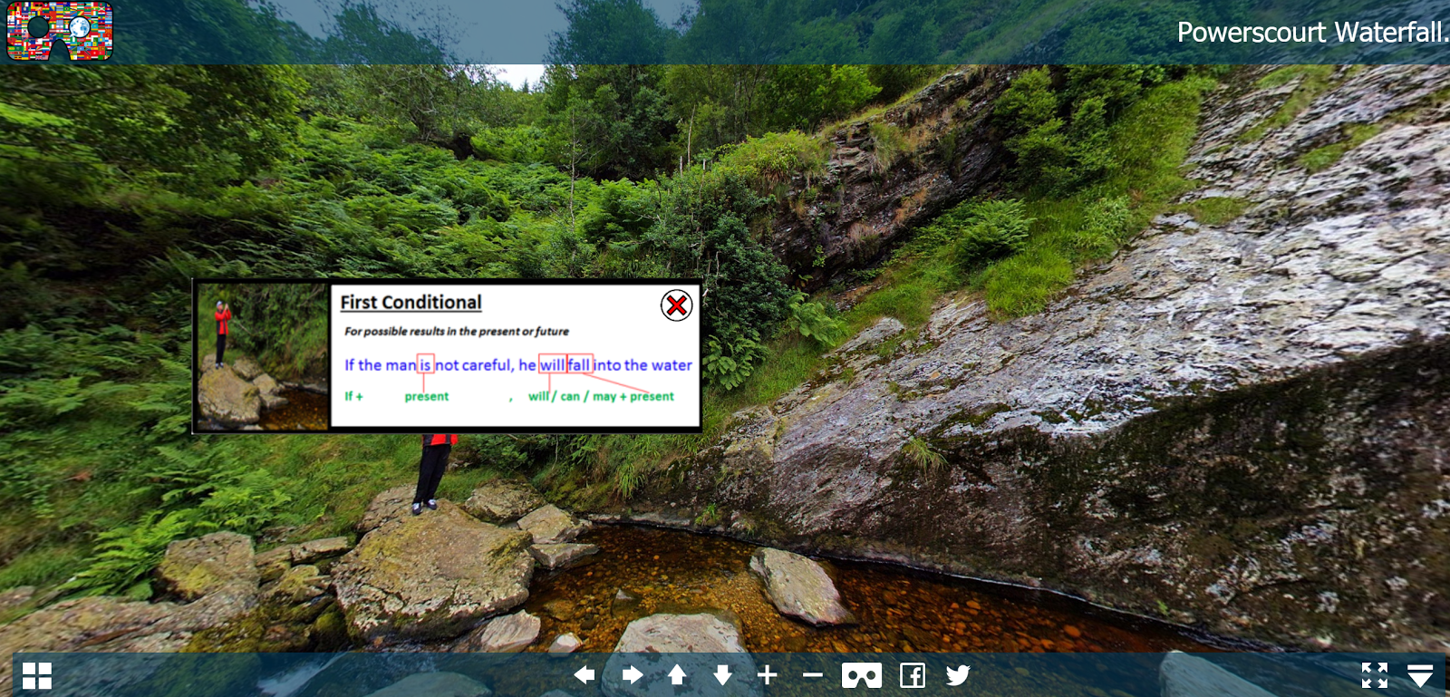 LinguaPracticaVR offers free English lessons in a virtual reality context. LinguaPracticaVR builds short lessons into virtual reality images of places in Ireland and the United Kingdom. For example, in the screenshot below you will see an image of the Powerscourt Waterfall. Within that image there are three short lessons about the words used to describe what is seen in the image.