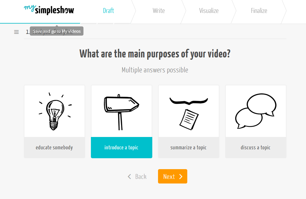 My Simpleshow requires you to write a script for your video before you can start adding illustrations and sounds to it. In My Simpleshow you will find a wide variety of script templates that will help you plan your video. The script is written in chapters that become the outline for your video. After you have written your script My Simpleshow will take your chapters and give you suggested images and animations to use. The suggestions are based on the keywords in your script. You also have the option to upload your own visuals to use in your video.