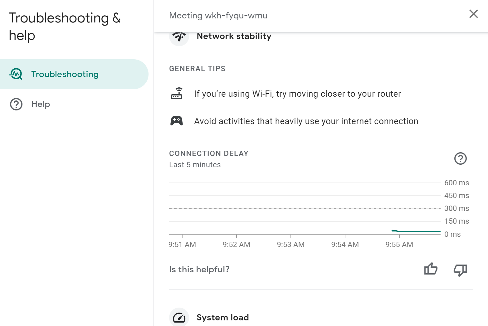 Some of the information that you’ll find in the Google Meet “Troubleshooting and Help” menu includes CPU usage/ load and tips for improving system performance. You’ll also find a live graph of system usage. The “Troubleshooting and Help” menu also includes many of the tips that you probably already know like “close unused tabs” and “move closer to your Wi-Fi router.”