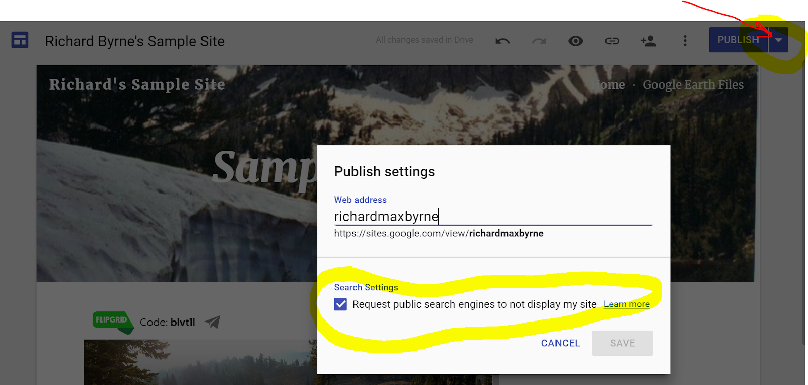 You might want your site to appear in Google Search results or you might not want it to appear in search results. If you don’t want it to appear in Google Search results, you can make that specification in the “publish settings” menu that appears just to the right of the “publish” button.