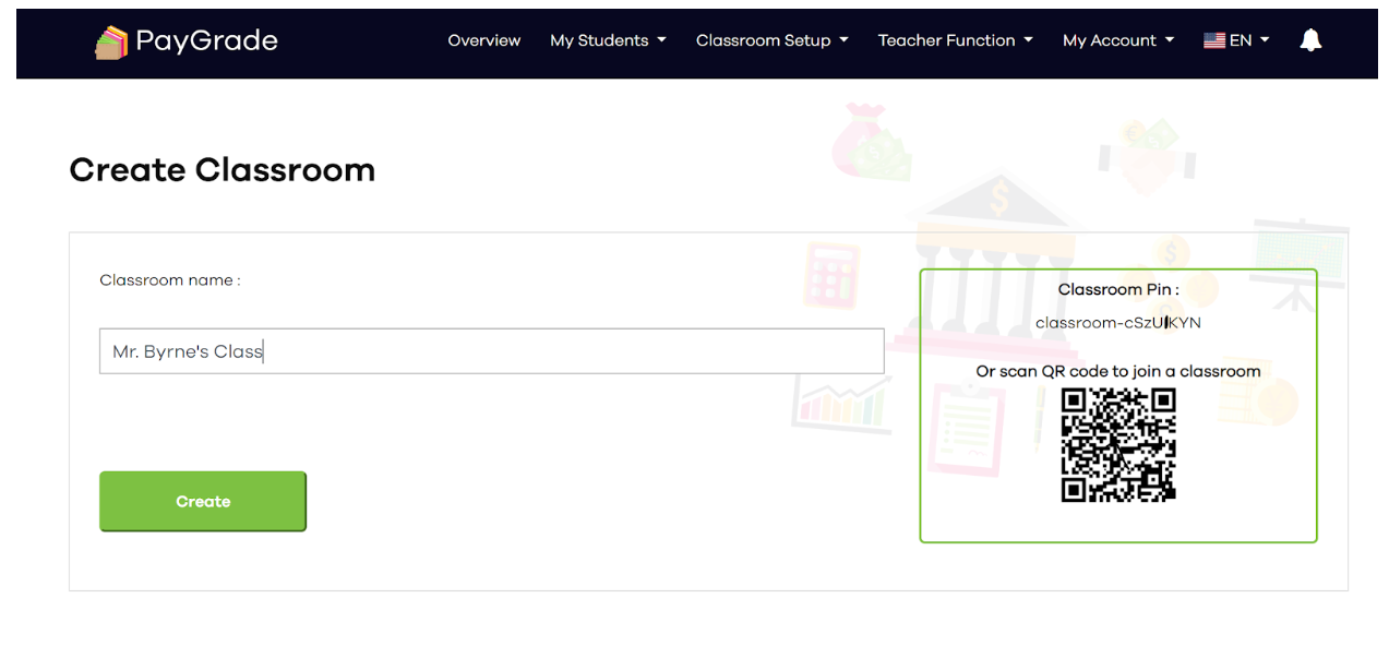 To get started on PayGrade you set up a classroom in which you’ll manage your students’ accounts. You can manually add students to your classroom by entering their names and assigning them passwords. Alternatively, you can give your students a join code to register themselves to participate in your PayGrade classroom. In either case, students don’t need to have an email address to use PayGrade. They simply need to remember their usernames and passwords which you can reset if they forget.