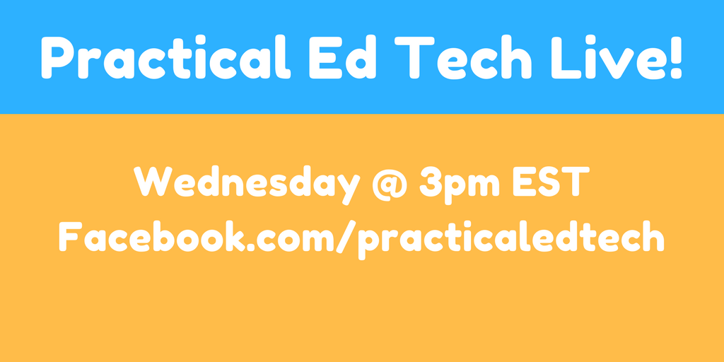 On a fairly regular basis I host live broadcasts on the Practical Ed Tech Facebook page. During those broadcasts I answer some of the many questions that I get asked about educational technology. You can email your questions to me or submit them live during the session and I’ll answer them on air. The next Practical Ed Tech Live broadcast will be tomorrow at 3pm EST. Join me!