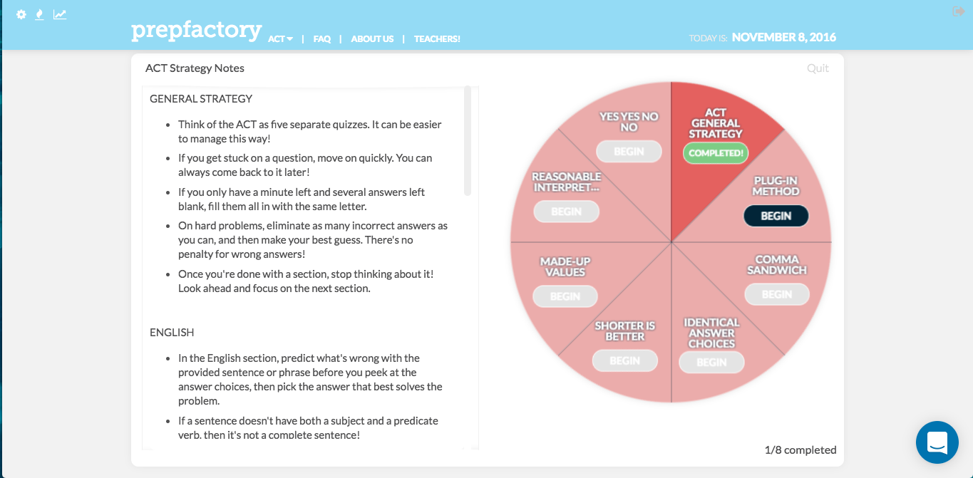 In each section of PrepFactory students have the option to complete a strategy review before attempting a series of review activities. Alternatively, students can just go to the strategy section of PrepFactory’s ACT & SAT sections. In the strategy section students can work through eight modules. The strategy module begins with an overview of the ACT and SAT in general. That section includes knowledge of the purpose of the test and general strategies that can be applied to almost any other test-taking situation. After completing the general strategies section students move on and work through seven specific methods for handling the sections of the ACT and SAT exams.