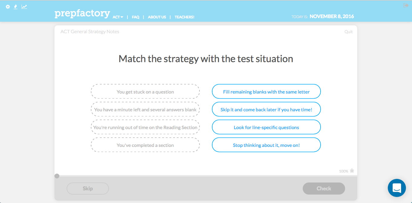 To keep the strategy lessons engaging, PrepFactory uses a variety of question formats throughout each unit. Students won’t be slogging through the same style of multiple choice for hours on end to complete a strategy review. Instead, each section is kept short and sweet with a mix of multiple choice, sorting, and fill-in-the-blank activities.