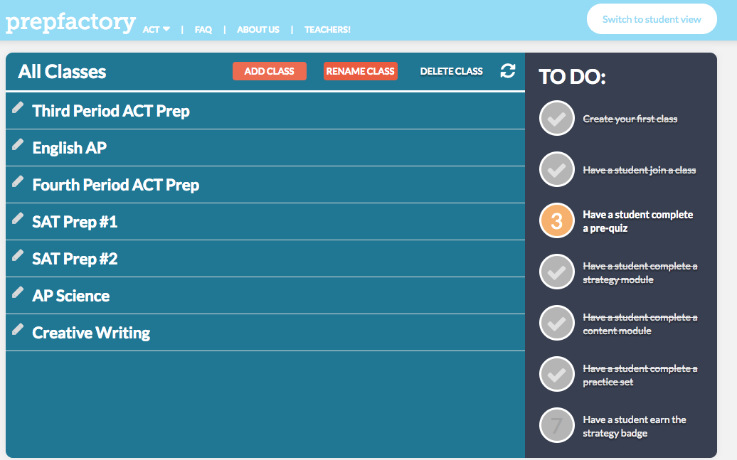 The latest update to PrepFactory gives teachers tools to keep track of the progress that their students are making. Teachers can create classrooms within their free PrepFactory accounts. Within their PrepFactory classrooms teachers can see where each of their students are in the progression of review activities. For example, a teacher can log-in to see how many students have completed a strategy session and which students have completed practice question sets.