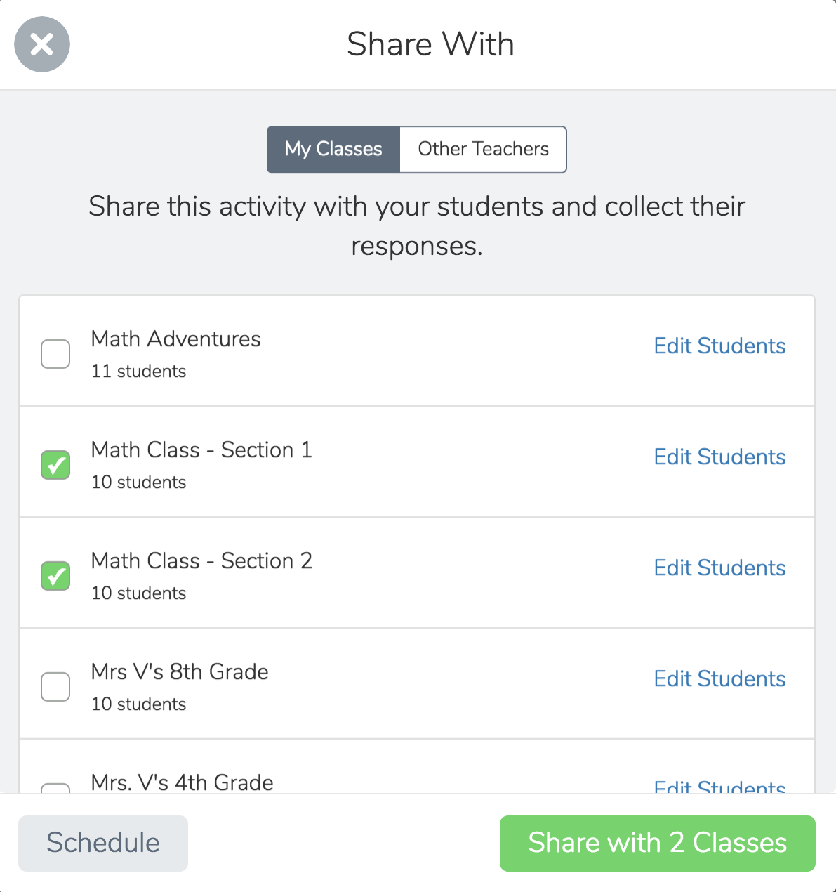 Last week when I talked to Carl Sjogreen, one of SeeSaw’s co-founders, he mentioned that workflow is one of the things they’ve worked hard to improve since Activities launched last fall. To that end, teachers can now share Activities to multiple classes with just one click. Previously, if you wanted to give the same activity to multiple classes you had to manually open each class and assign activities to students. Now that can all be done from one place when you’re viewing one of your SeeSaw Activities.
