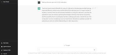 By the way, after writing all of the above I asked ChatGPT to write something about the pros and cons of AI in education. The screenshot below shows what it generated. (Click the image to view it in full size).