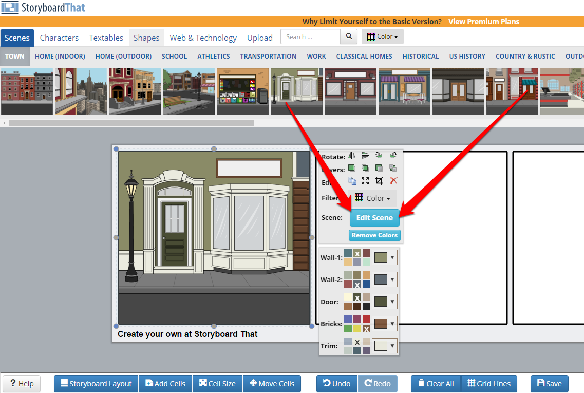 Now when you drag a background scene into a frame on Storyboard That you can edit the scene by adjusting the color scheme, by changing the lighting (time of day), and by adding or removing elements from the scene.