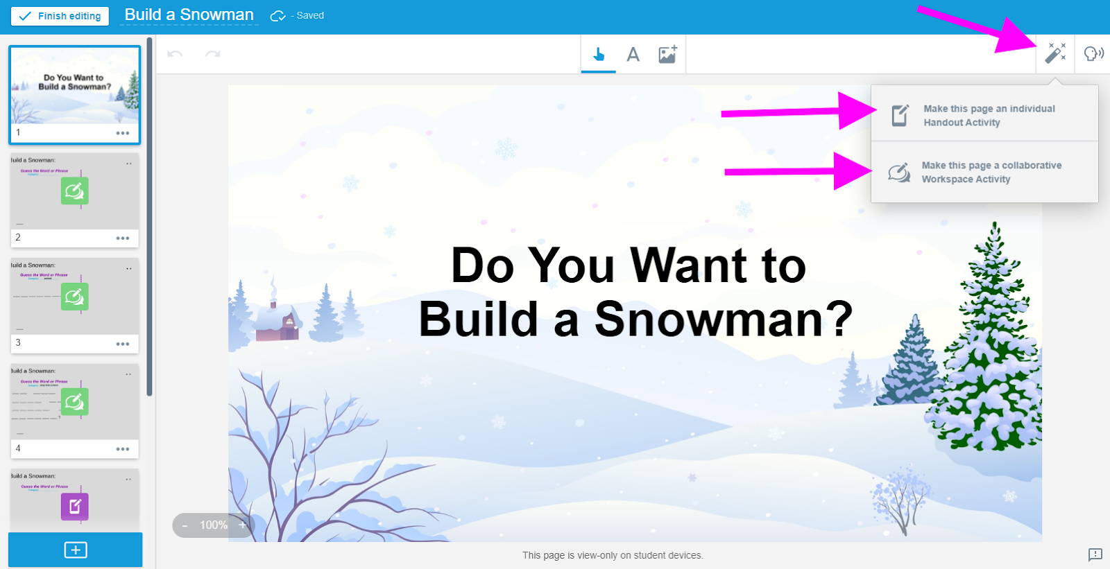 In Lumio you can make any page in any lesson a collaborative activity or an individual activity. To do that simply click on the magic wand icon while editing your activity then choose collaborative or individual. The collaborative option provides the whole class with access to one shared copy of the activity. The individual option provides each student with his or her own copy of the activity to complete.