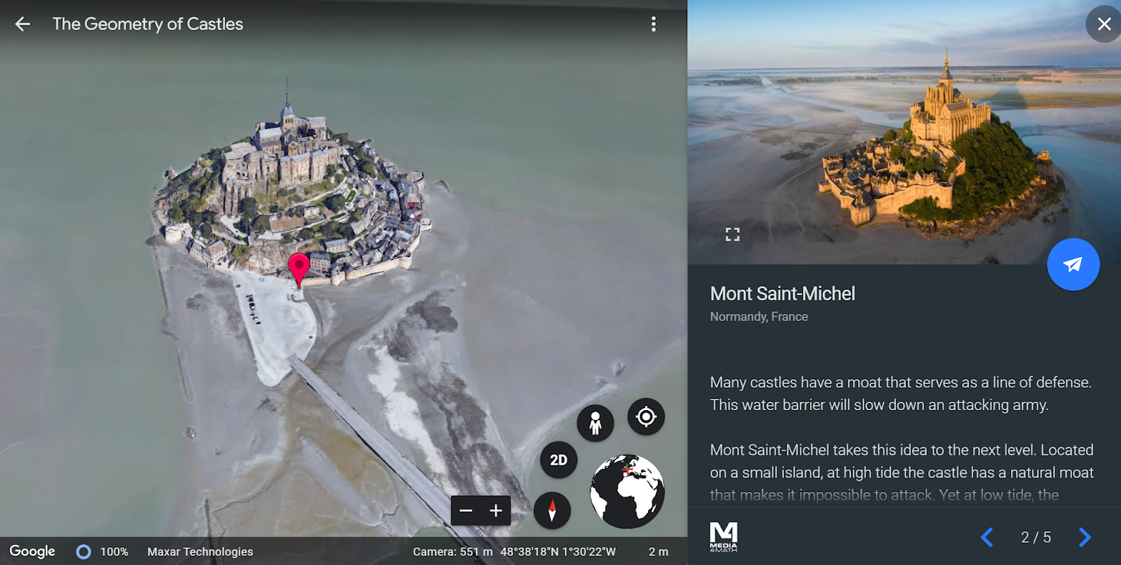 In the web browser version of Google Earth there is a section called Voyager. Within the Voyager section you’ll find lots of pre-made tours, quizzes, and activities. One of those activities is called The Geometry of Castles.