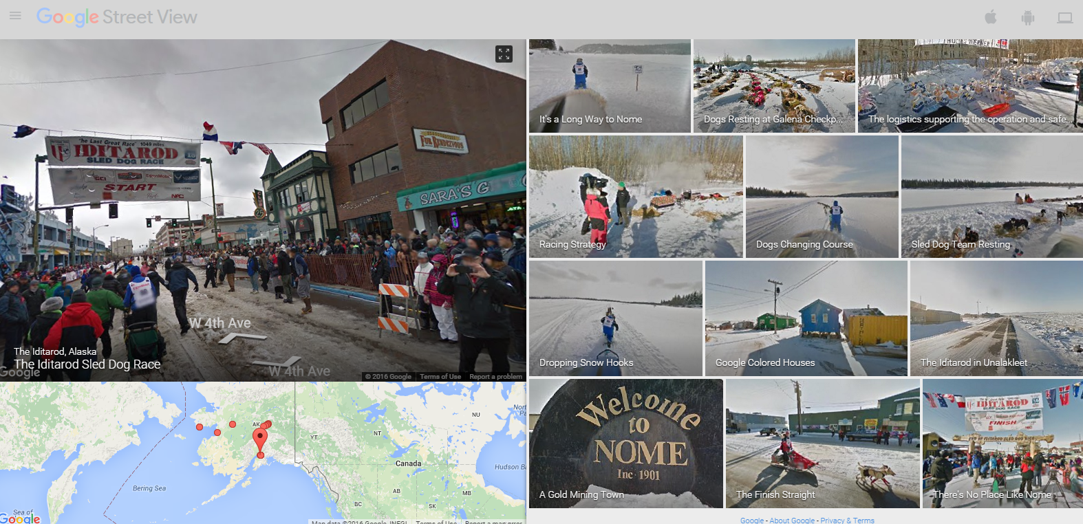 The Iditarod Sled Dog race begins today. It’s one of the events that I would love to see in person some day. While I cannot get there in person this year, I can view it in Google Street View. Earlier this week Google published a new collection of Street View imagery capture along the Iditarod trail in 2015. The imagery takes viewers from the start in Anchorage, along the trail, into pit stops, and eventually to the finish line in Nome. All of the imagery can be found here.