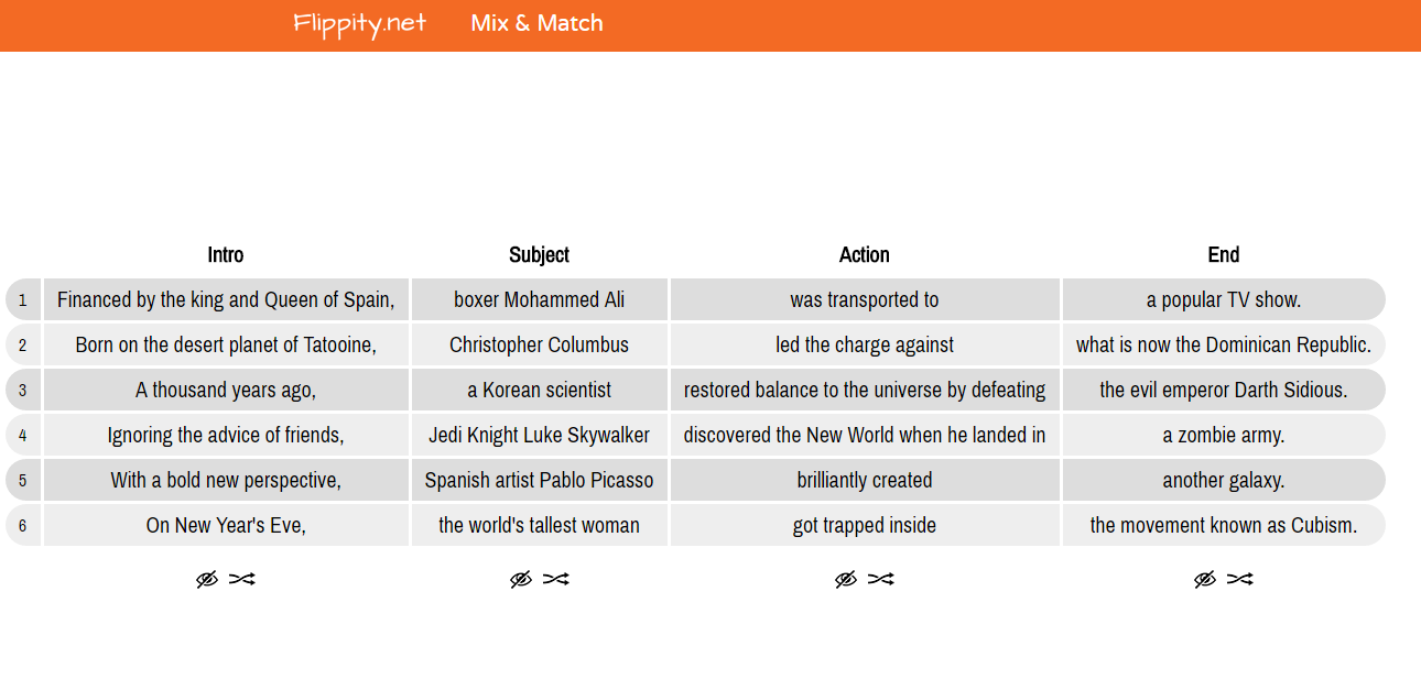 The latest Flippity template is called Mix & Match. Mix & Match lets you create an online grid that features random bits of information or random phrases that you write into your spreadsheet. You enter the information that students see into a spreadsheet arranged in columns with headings of your choosing. When students view your Mix & Match page they can then hide parts of the page’s display to create sentences. See the demo here or look at the screenshot below for a visual.