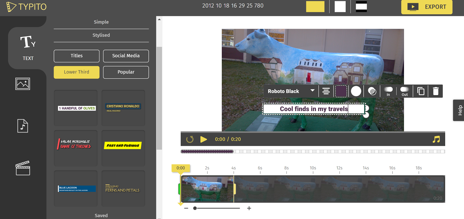 To get started on Typito you upload a picture or a video clip and then add a title for your project. After the initial file is uploaded you can upload more images and video clips. You can control how long each item is displayed in your video. Typito provides many options for placement of text over your images and videos as well as the style of the text that you use in your video. Finally, you can upload your own audio or use some of the music provided in the Typito library. Finished Typito videos can be downloaded to your computer, uploaded directly to your YouTube account, or shared via social media.
