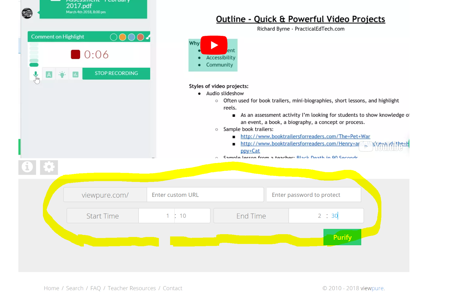 Over the weekend I shared information about ViewPure’s curated playlists for teachers and students. Another feature of ViewPure that you should note is the option to share just a portion of a video and to password protect it when you share it.