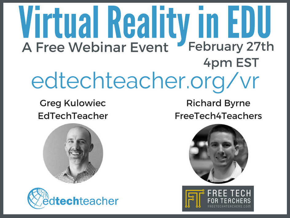 Virtual reality has the potential to provide our students with great learning experiences. It is still in its early stages of adoption in schools and there are lots of questions about how it works and how it can be used in classrooms. On February 27th Greg Kulowiec from EdTechTeacher and I will host a Google Hangout On Air to talk about virtual reality in education. I hope that you can join us for this free event.