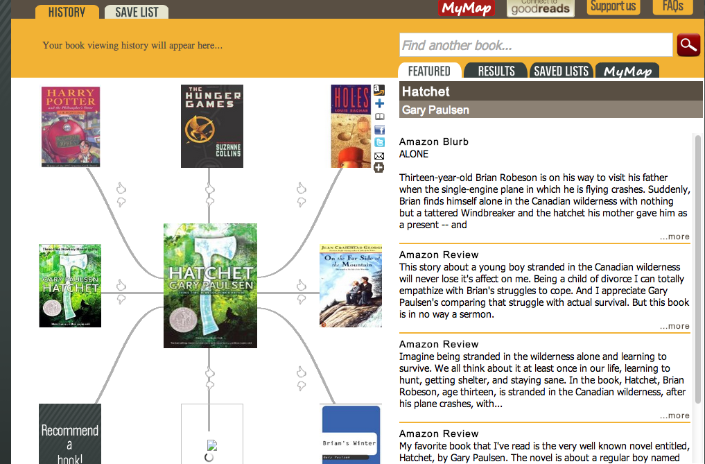 Your Next Read is a site that provides you with a web of book recommendations based on the authors and books you already like. Here’s how it works; type in the title of a book you like or author you like and Your Next Read will provide you with a web of books that might also enjoy. Click on any of the books appearing the web to create another new web. Below you’ll see the web of recommendations that appeared when I typed in Gary Paulsen’s Hatchet.