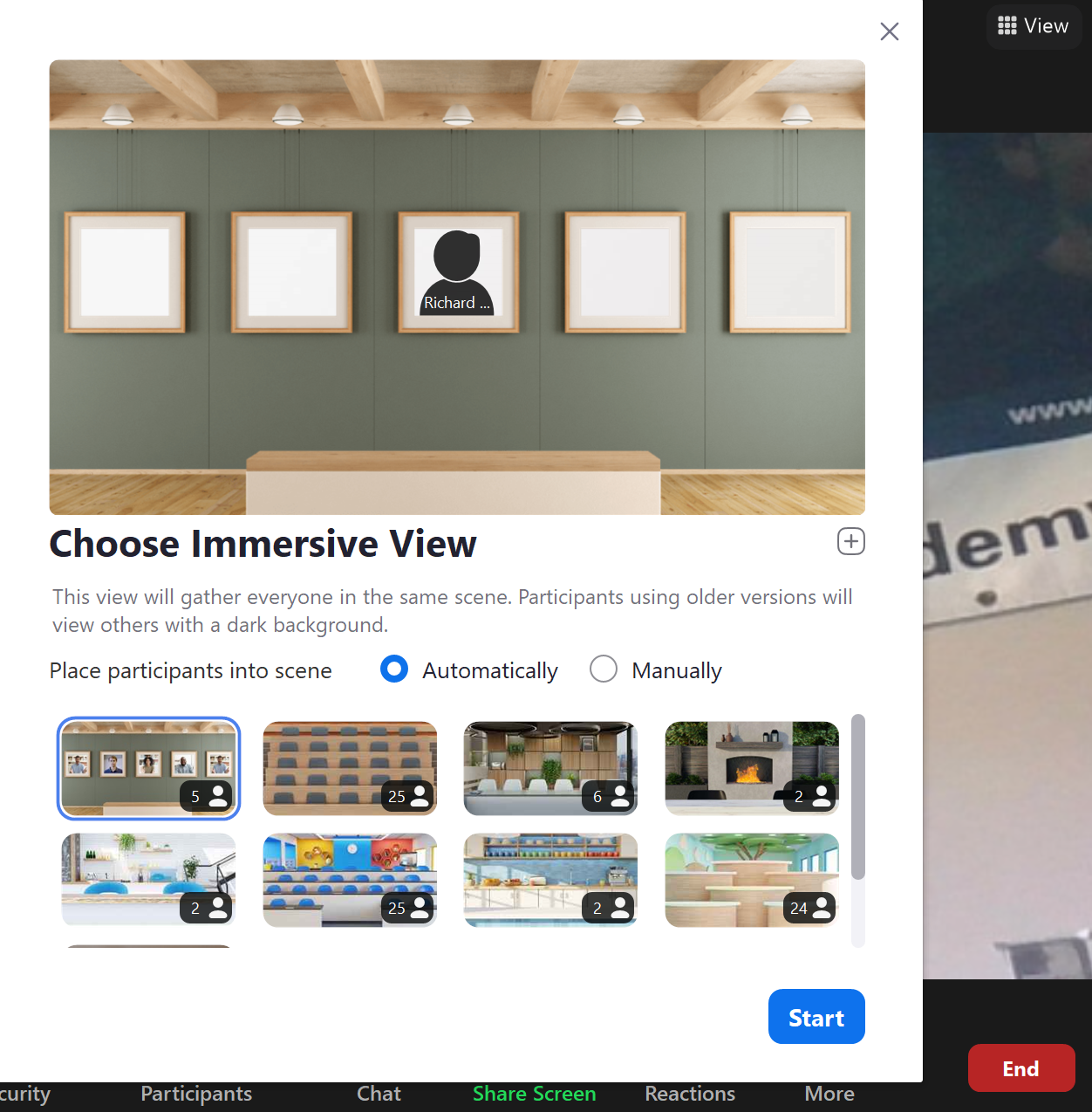 Zoom’s immersive view will show your meeting participants on same screen in background of your choosing. Zoom has a bunch of pre-made immersive view backgrounds that you can pick from including an art gallery view, a fireside chat view, board rooms, and even an outdoor setting. You can also upload your own image to use as part of an immersive view.
